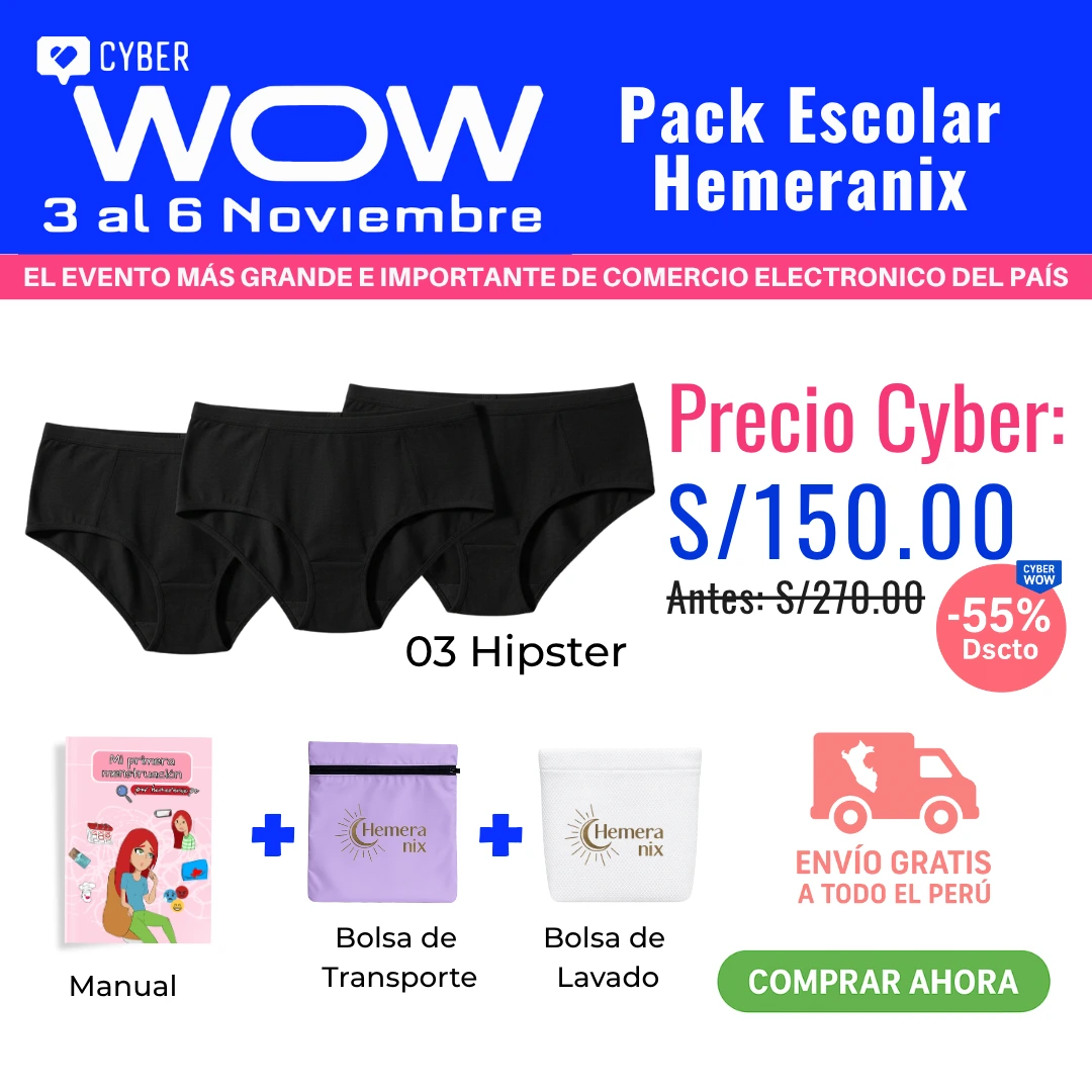 Durante el Cyber Wow Hemeranix, aprovecha un 55% de descuento en el Pack Escolar Menstruación, un kit completo creado para acompañar con confianza y educación el inicio de la menstruación. Incluye 3 calzones menstruales, un manual educativo “Mi Primera Menstruación”, y dos bolsas : una para transporte y otra para lavado. Todo con envío gratis a todo el Perú, disponible solo durante la campaña Cyber Wow.
